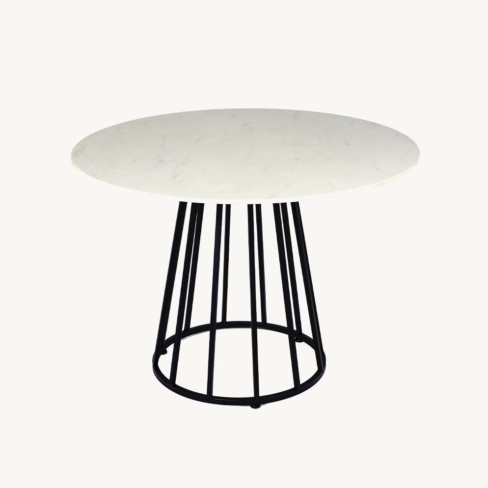 The Darcie! Perfect for those smaller spaces. This round dining table comfortably fit 4 chairs and would fit in any kitchen or dining area. This is the faux marble option with black metal base but we have the brown wood top option also or get in touch for custom combinations.