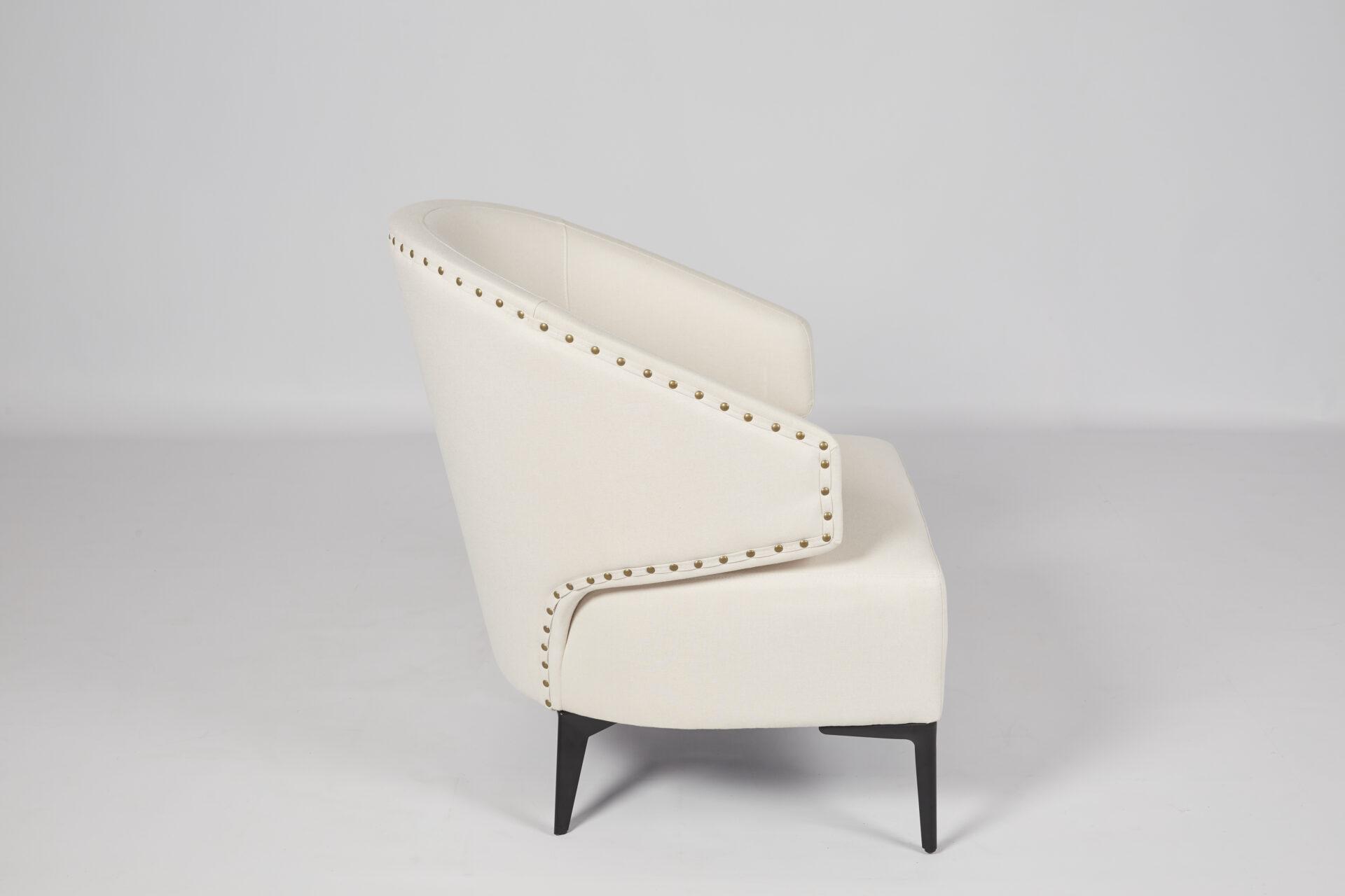 The Hala! A beautiful light cream fabric Armchair with gold button detailing and black legs. Pair with the Hardy Sofa to complete the look. Get in touch for bespoke colours!
