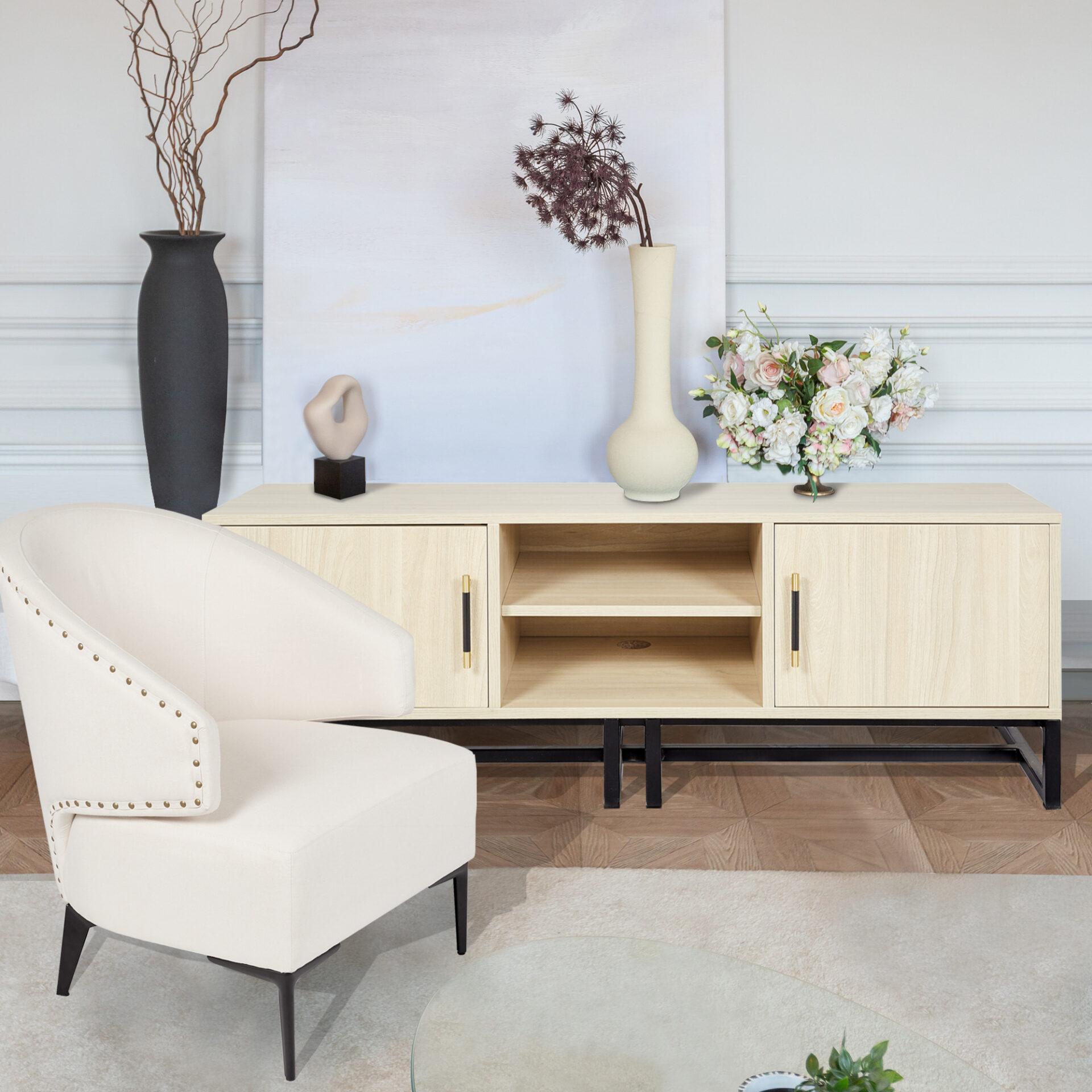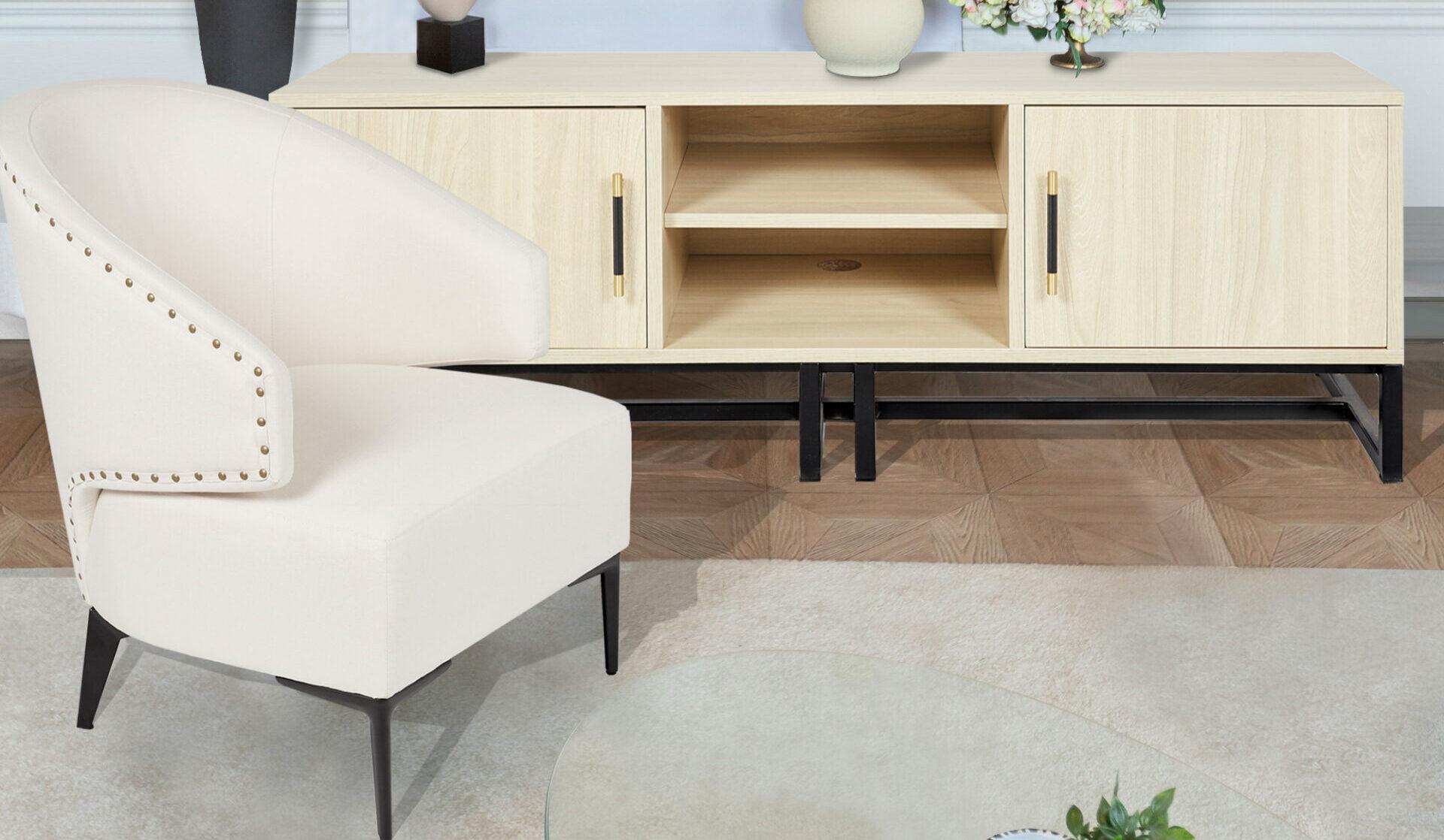 For those cosy Netflix nights and fun Saturday evenings, we’ve got you covered with our Tabby unit and Hala armchair. Our Tabby unit is a statement with light maple and uniquely designed handles with gold detailing, this piece is the perfect stand for your tv and/or other accessories. Designed with shelving that fit your needs, this piece is practical and beautiful. Our Hala armchair is all about the detailing with intricately placed buttons along the back and arm rests. Sink into our Hala armchair and curl up with a good book, watch your favourite programme or entertain your guests. We’ve got you covered.