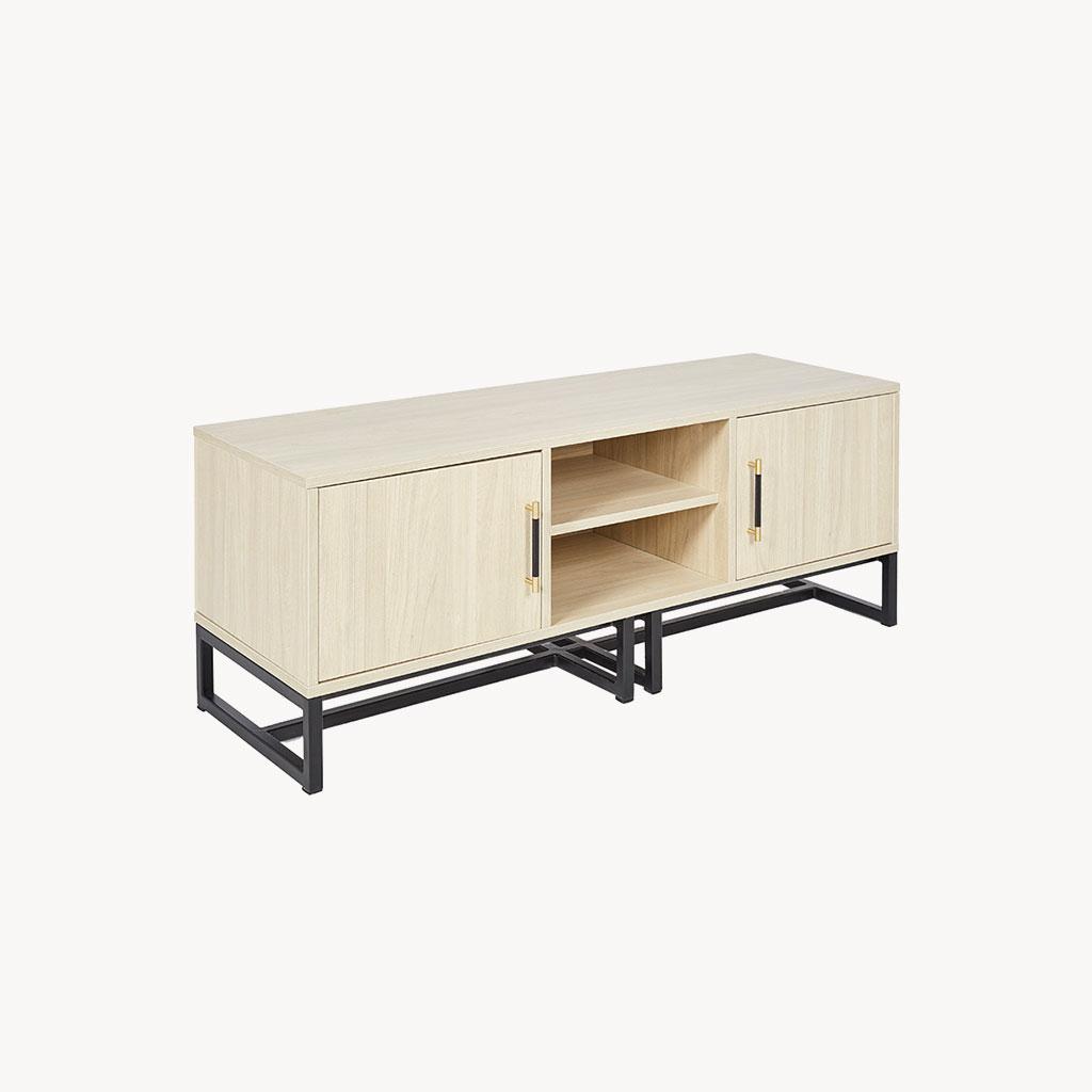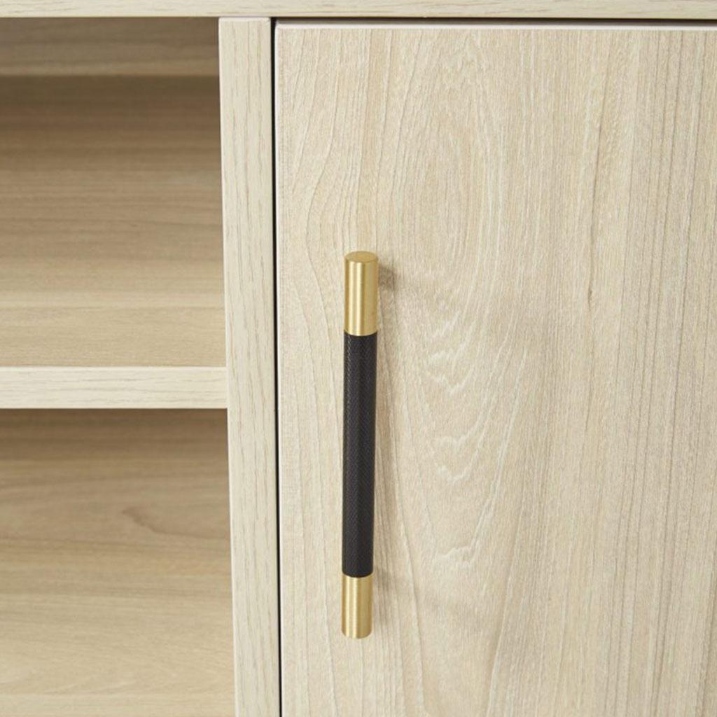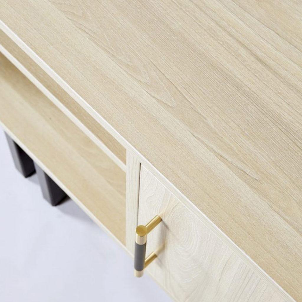 The Tabby! A stunning TV Unit fit for any living room space. The piece is made of a beautiful light maple wood veneer with gold metal accents and black hardware. The handles are black faux leather and gold metal, and really elevate the whole product. Pair with our Lalo Sideboard to create the perfect set.