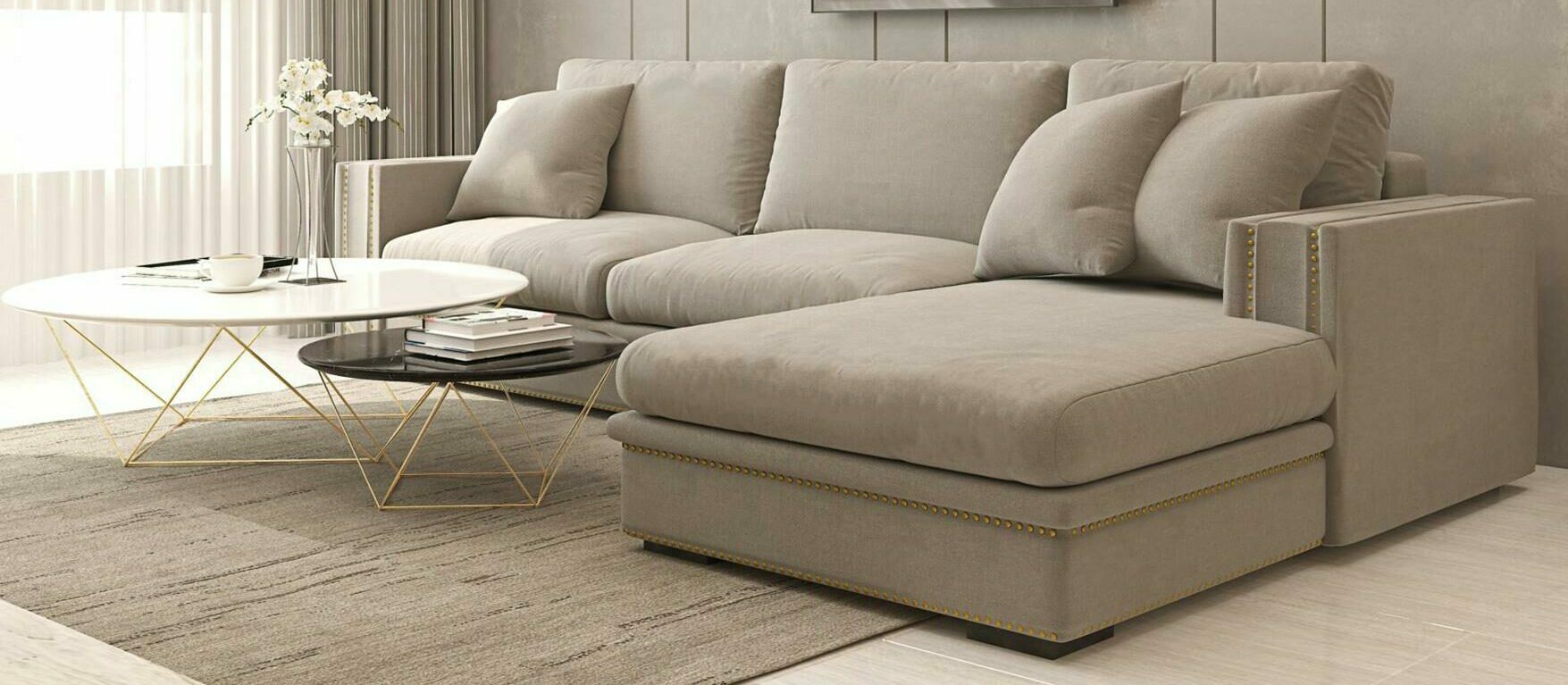 The Pacific! A beautifully stylish corner sofa upholstered in our luxuriously soft fabric finished with gold button detailing for that added luxury. The sofa is extremely comfortable and cosy filled with our bespoke foam filling, making it soft but still extremely supportive without losing its shape. It comes in a variety of colours to suit any palette and right or left orientation to fit the space perfectly! If gold isn’t your colour, this also comes with silver button detailing!