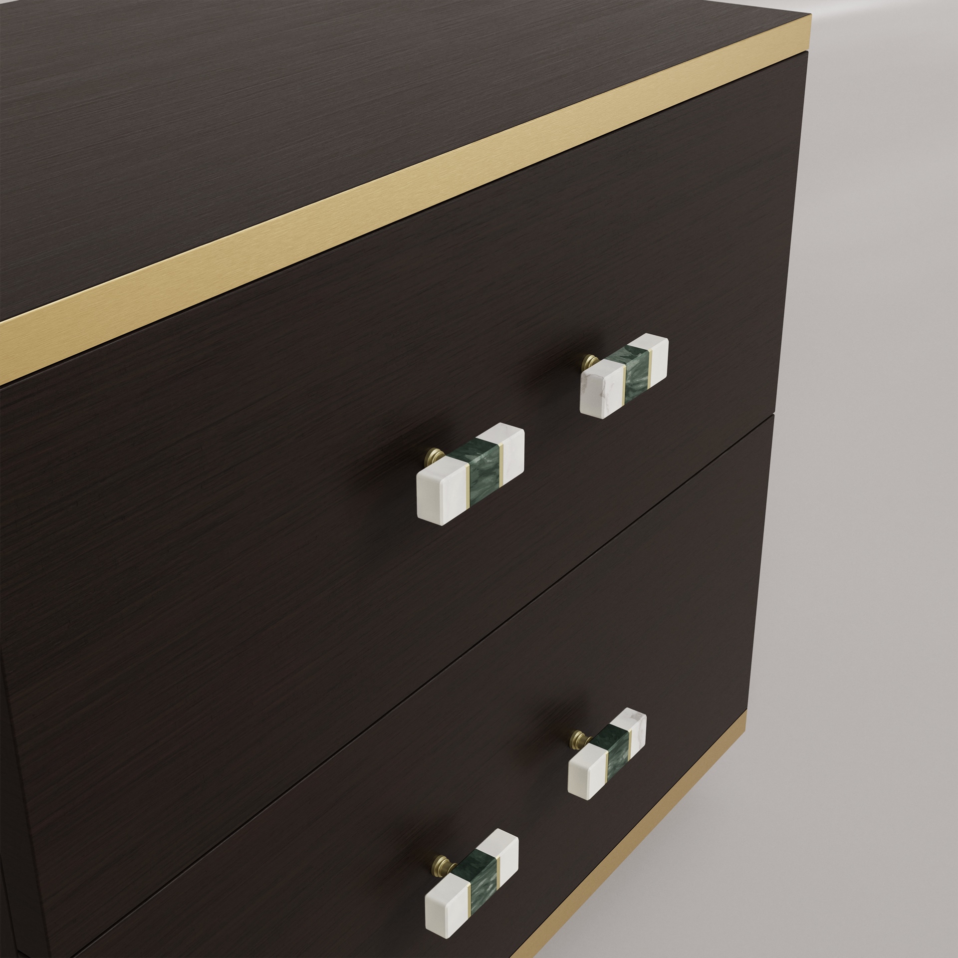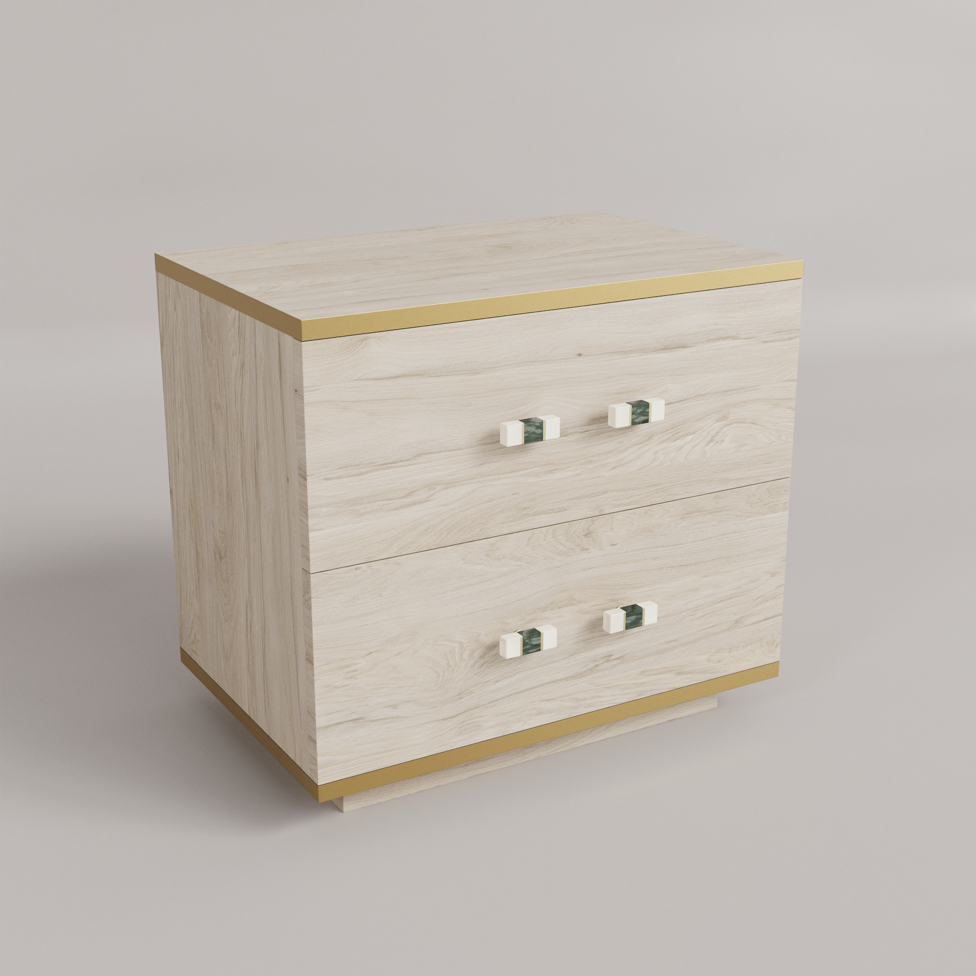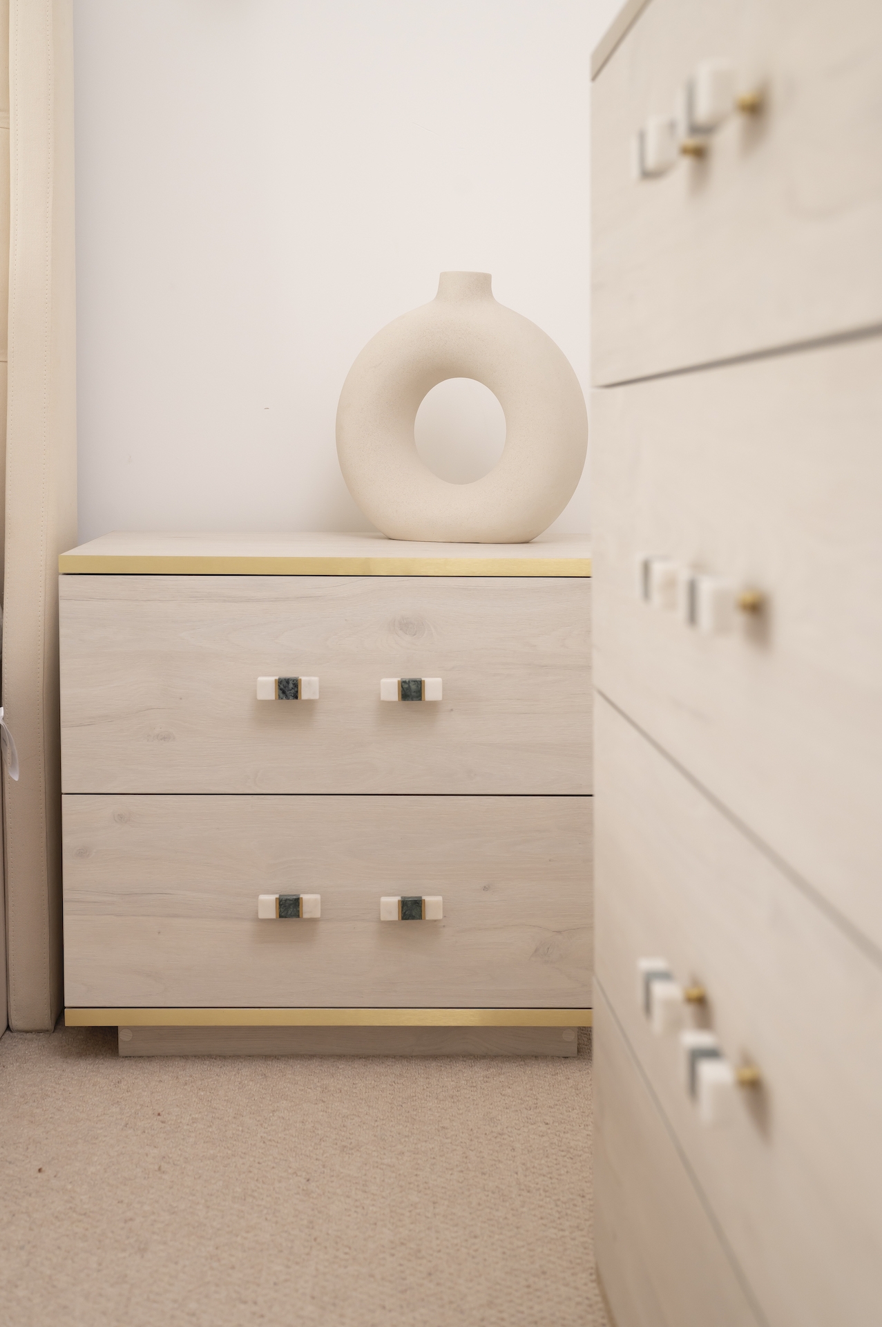 Designed for style and practicality, the RILEY bedside table and matching drawers are perfectly aligned to fit in your bedroom (or any room!) as your go to storage. Designed with metal detailing, and marble handles with small gold inlays, the cabinetry looks impressive in any room, beautiful in neutral tones or stand-out in your colour choice. With natural marble handles with green Verde Indio marble and cream and grey Carrera marble. the handles are the added detail. Our bedside tables and drawers are carefully hand made with recycled wood veneers, sourced from UK forests and are graded as top level environmentally friendly as the wood veneers are sliced from renewable tree species. They are extremely wear resistant, and are finished with an extra coating to enhance stain-resistance and scratch-resistance by 97.3%, which also makes them wipeable to ensure non-absorbent properties. From our customer feedback and research, our cabinetry has the highest rating out of 5 stars in relation to style, everyday usage, wearability, non-absorbent abilities, stain and scratch resistance.