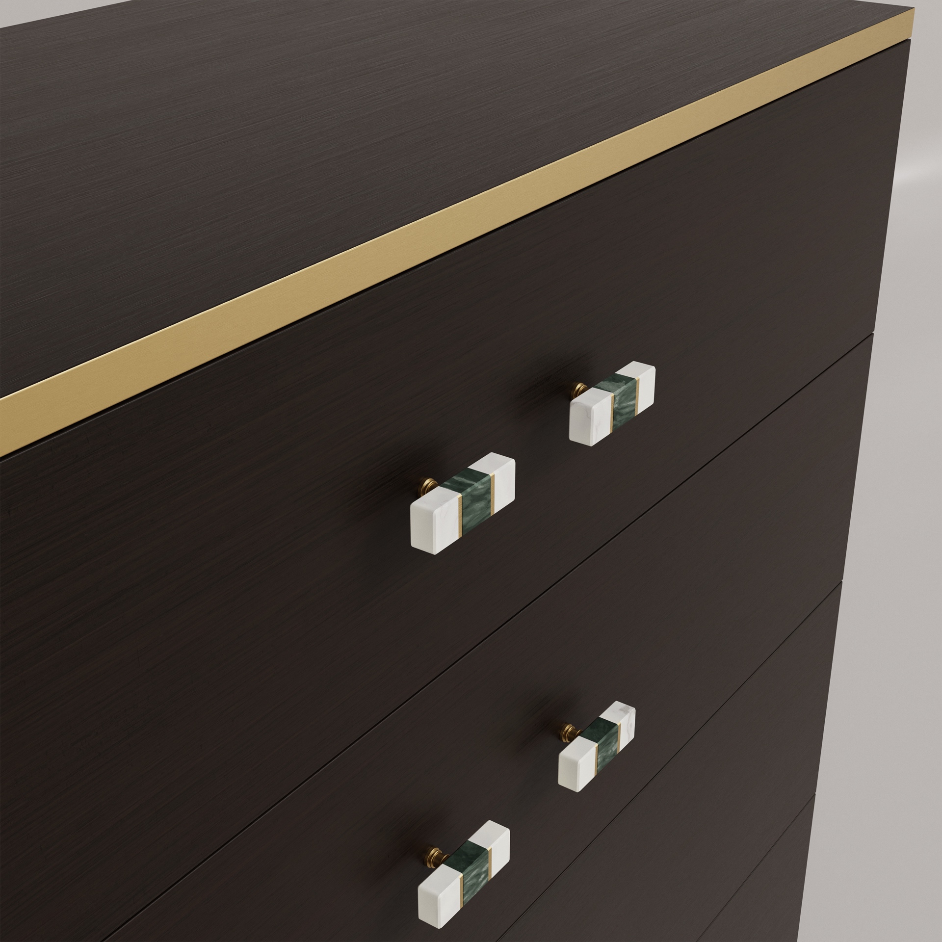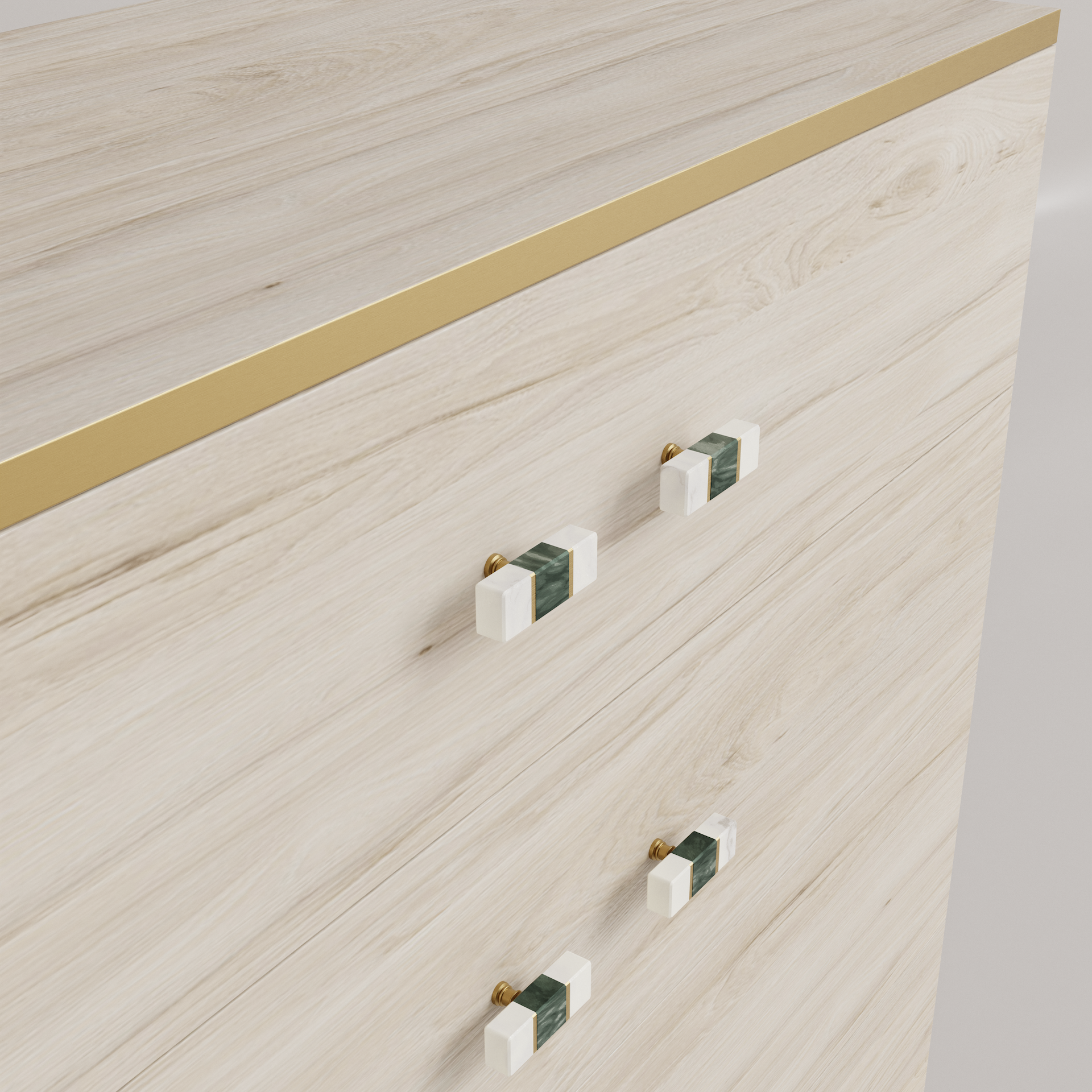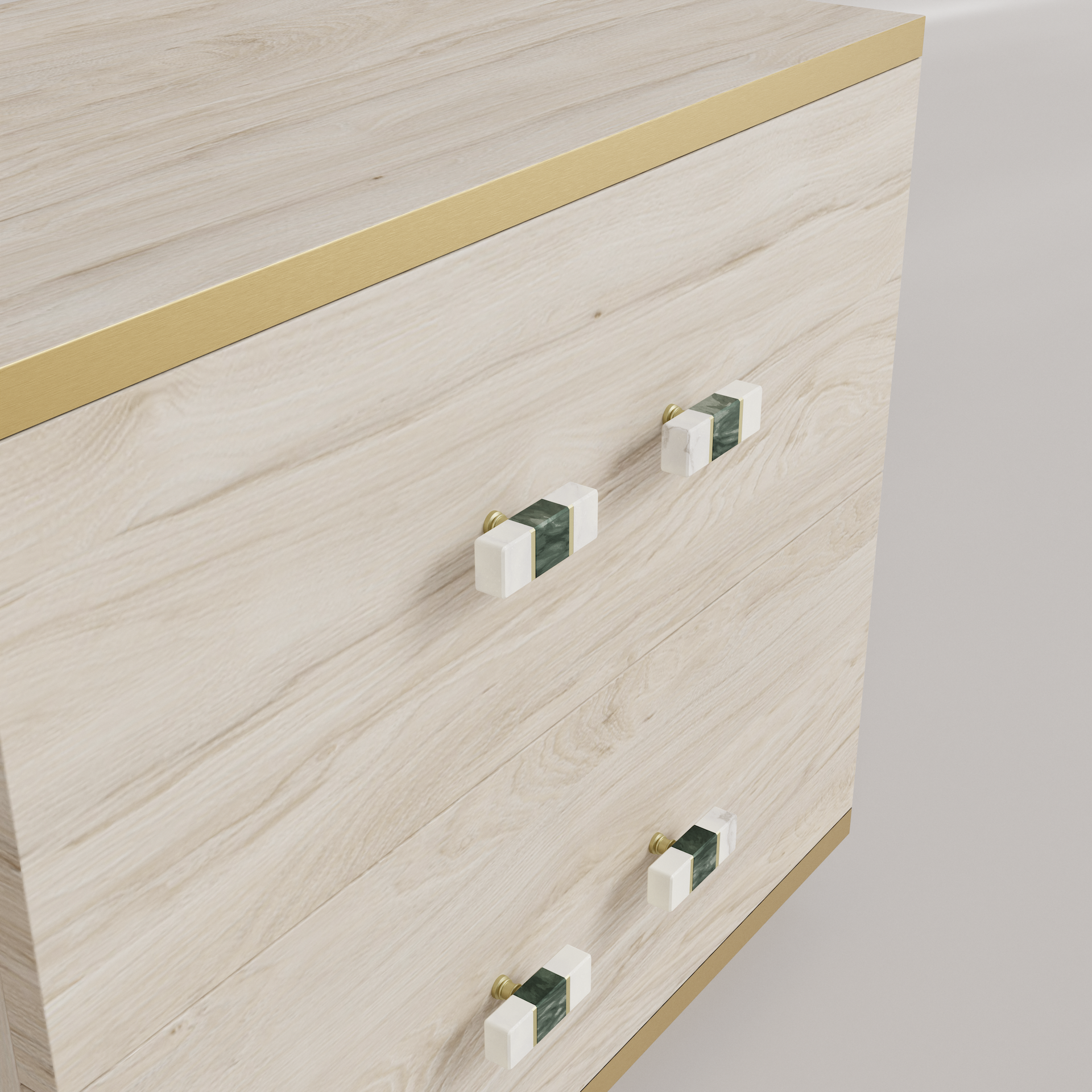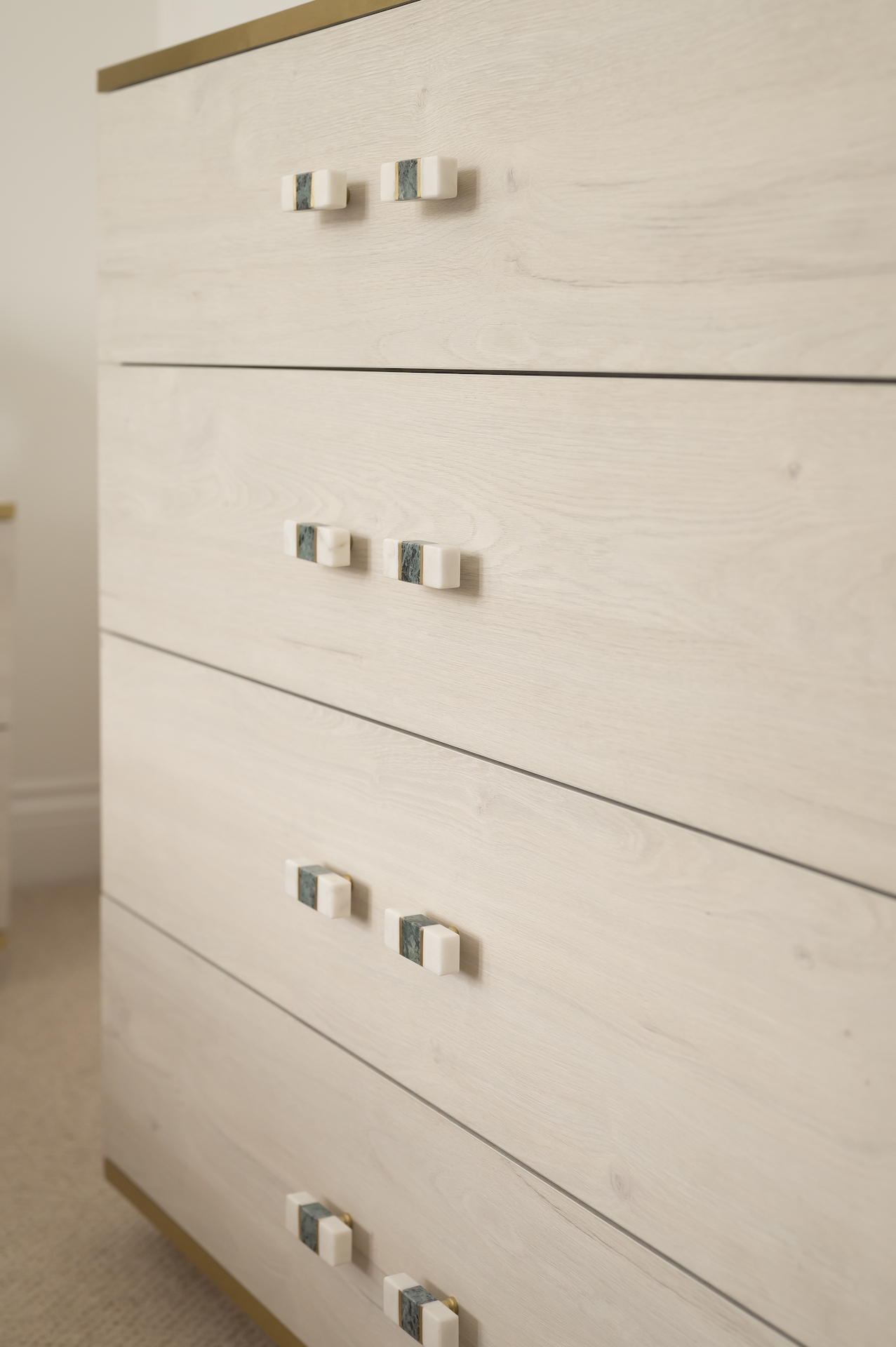 Designed for style and practicality, the RILEY bedside table and matching drawers are perfectly aligned to fit in your bedroom (or any room!) as your go to storage. Designed with metal detailing, and marble handles with small gold inlays, the cabinetry looks impressive in any room, beautiful in neutral tones or stand-out in your colour choice. With natural marble handles with green Verde Indio marble and cream and grey Carrera marble. the handles are the added detail. Finish the look with one of our stunning marble lamps. Here we have chosen Eiffel to perfectly highlight the detail in the handles.