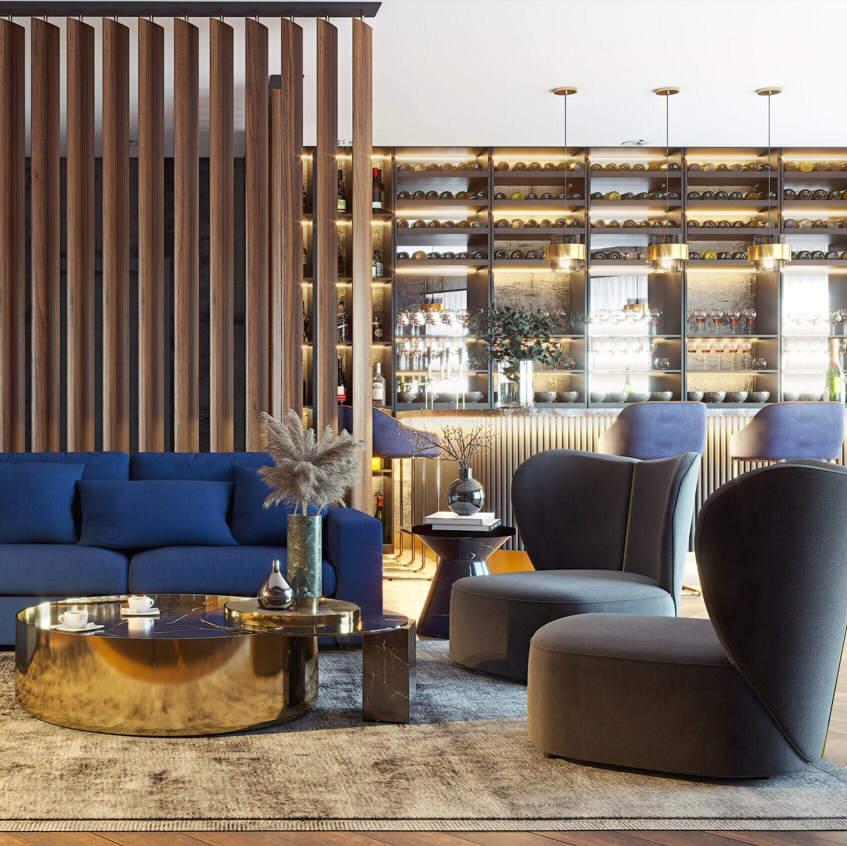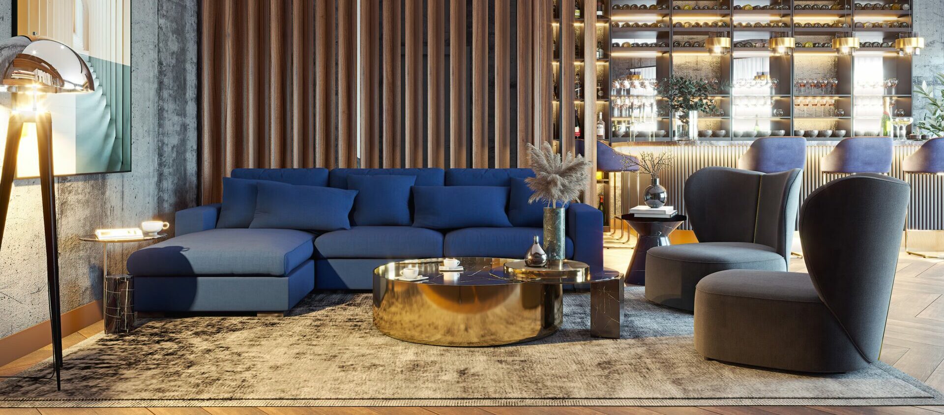 The ultimate living room set. Pairing the beautiful blue Phoebe corner sofa with the Jasmine armchair creates an opulent look perfect for any living space. The deep blue creates a wonderful pop of colour and contrasts beautifully against the gold and grey armchair. A place to relax and unwind or entertain and make memories.